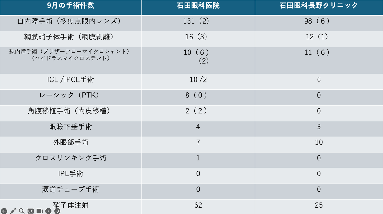 9月は石田眼科110周年記念式典があり、慌ただしい1か月となりましたが、今月も多くの患者様の手術を執刀させていただき、心より感謝申し上げます。