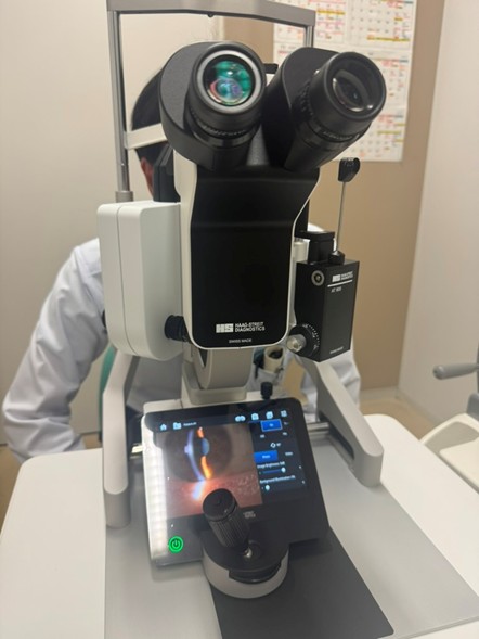 本機の特徴は、従来のLED照明に比べてより高解像度かつ高コントラストな観察が可能である点です。実際に使用してみた印象としても、観察画像が非常に鮮明で、細部までクリアに確認できると感じました。スリットランプは私たち眼科医にとって“商売道具”とも言えるほど日常診療で欠かせない機器であり、その性能向上は診療の質に直結します。