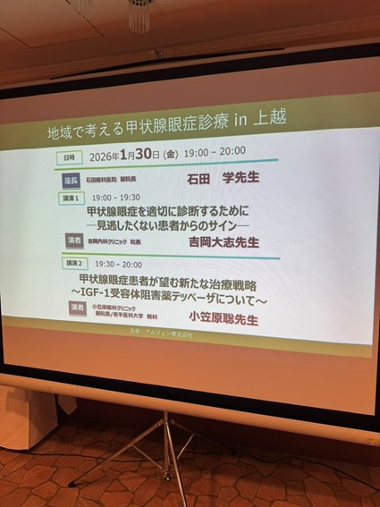当日は、上越地域の内科の先生方にも多数ご参加いただき、甲状腺疾患と眼症を「地域全体で診る」ことの重要性を改めて共有できる、大変意義深い会となりました。内科と眼科の顔の見える連携が、今後さらに深まるきっかけになったと感じています。