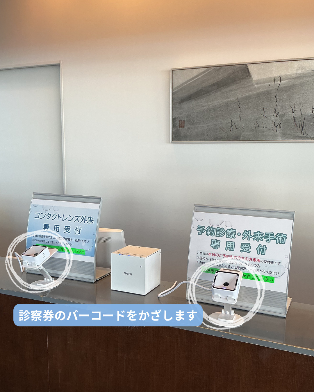 受付の際は診察券のバーコードをかざしていただきます。